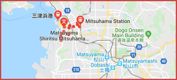 From Ehime, Matsuyama castle (松山市大手町 Matsuyama Otemachi) to 三津浜 Mitsuhama beach.